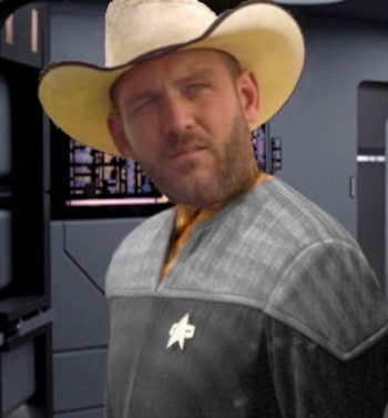 | Strengths & Weaknesses | He’s a problem solver: hasn’t met a problem he’s not being able to get his head around with time and questions. “Ain’t no problems ‘cept the ones stopping you from solvin’ the first one. Big old reactor like this, why it ain’t nothing but a ball of math. Man counting with his toes can get his head around it with time. Solve that problem, then the next, and before you know it you’re breaking the laws of physics and seein’ things that are downright fantastical.” He’s from Montana… “This ain’t steak. Oh, you can address me on the topic of matter just being protons and electrons and all their bonds and what not. But this here reconstituted matter from a replicator ain’t no side of Montanan prime steer. You want me to talk about the power of a divine being, you just find me an open flame and a good piece of flank steak, and I’ll write up a sermon for you and the crew.” He also has a deathly fear of spiders and other animals with more than four legs and skitter. He has said, on occasion, that they are also proof of a divine being: and that it hates us dreadfully. |