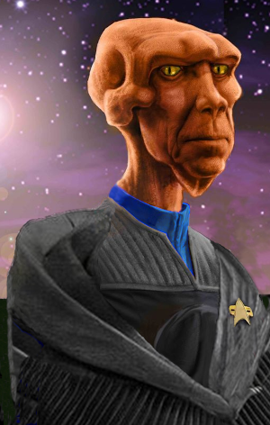 With three arms and three legs like all Edosians, there is a particularly arachnid quality to Specialist Arex's appearance. The earth tones of his leathery skin make his yellow eyes pop. |